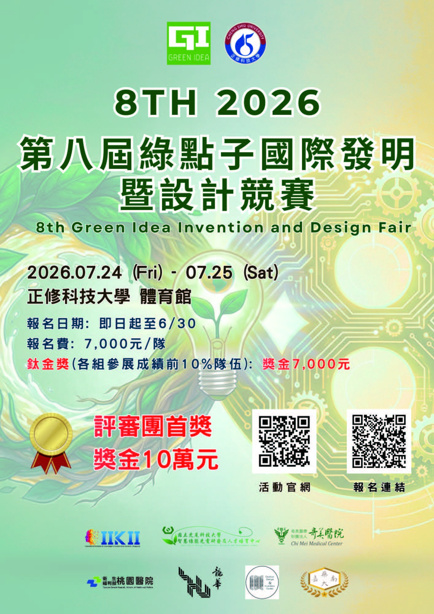 【競賽訊息】正修科技大學舉辦「2026年第八屆綠點子國際發明暨設計競賽」,開始受理報名!